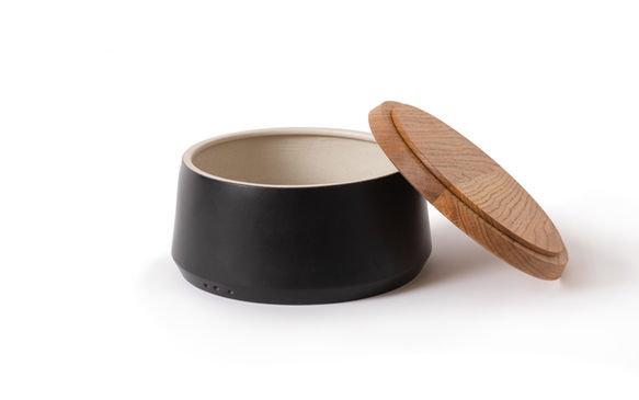 Pots are available in light natural colour or black glaze with lids in walnut, oak and ash in two sizes each.